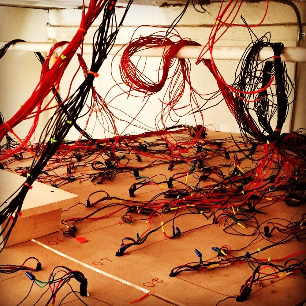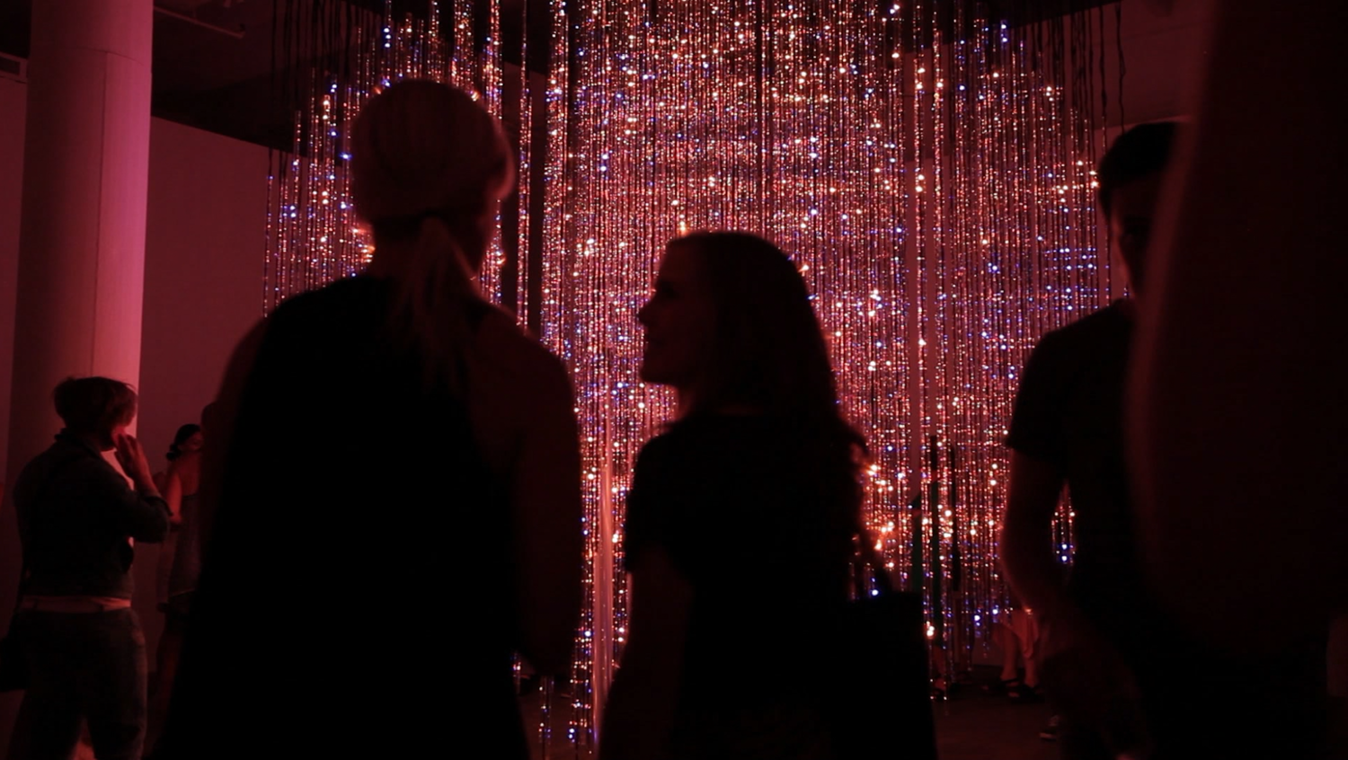 The entire installation was prototyped, built, wired, and maintained by a core team of four B-Reelers, dozens of volunteers and PAs, and Upstage, who handled the drop ceiling rigging. The final piece is comprised of 13,221 LED’s, 14 FadeCandy controllers, over 2,500 of tubing, roughly 40,000 feet of wire, and an experimental radar sensor called the Xethru. Responsive sound design adds a second dimension to the piece and was engineered by our friends at one thousand birds.